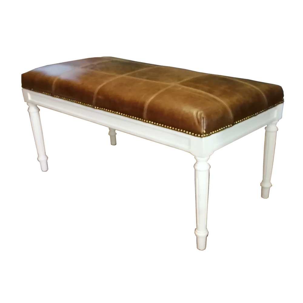 Banqueta con tapiz de cuero u estructura de madera, pies de madera pintada blanca.